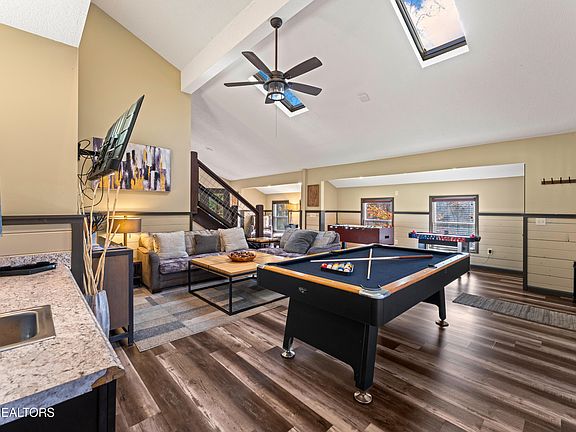Luxurious Updated Mountain Retreat in a Stunning and Private Setting. Nestled within a prime Sevierville location a mere 1.5 Miles to the heart of Pigeon Forge, this completely updated 4-bedroom chalet offers a seamless blend of refined elegance and functionality. A long, paved driveway surrounded by the peace and calm of nature welcomes you and your guests, offering an immediate sense of arrival and privacy. Step inside to find a dramatic vaulted great room featuring a handsome electric fireplace, where light reigns supreme thanks to numerous windows and skylights that illuminate the whole center of the home. From the understated yet stunning modern finishes to the richly appointed furnishings and decor, every element has been meticulously designed and executed. The floor plan is emphasized with entertaining and everyday living in mind, featuring an open concept that offers a little bit of everything including a comfortable living space, gaming area with ample entertainments, wet bar, laundry closet, dining room with fireplace and a kitchen equipped with stainless appliances, plenty of cabinet space and breakfast bar with pendant lighting. Two main floor bedrooms include a bunk room and primary suite with direct access to the sprawling outdoor landscape. The upper level presents two additional bedrooms, and the bathrooms across both levels are contemporary bliss. This superb home seamlessly blends indoor living with the beauty of the outdoors, offering numerous exit points to view nature's masterpiece directly, complete with large decks and numerous seating destinations including fire pit, or enjoy the therapeutic experience of the hot tub while the sights and sounds of nature lull you into a state of pure relaxation. This wheelchair accessible mountain chalet is perfectly tucked away in a peaceful and private setting yet enjoys quick and easy access to the area's best attractions and conveniences. A fantastic turnkey investment for your portfolio! Buyer to verify all information.
