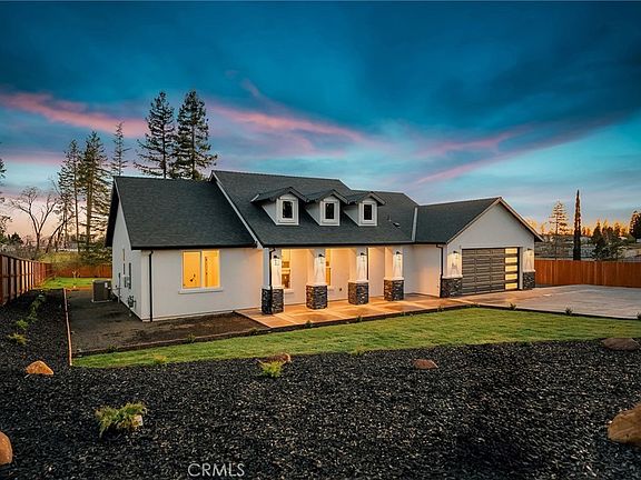 Nestled in the scenic mountain community of Paradise, CA, this beautiful new home offers the perfect blend of comfort and convenience. Paradise is known for its peaceful atmosphere, excellent schools, and friendly community, with paved town roads and underground utilities enhancing the charm of this inviting neighborhood. This home stands out with great curb appeal and a large stamped concrete driveway, providing plenty of space for parking, including RV/Storage parking to the side of the garage. The front yard is professionally landscaped, adding to the overall appeal. Inside, this home shows incredible attention to detail—even though the floor plan has been built around town, the seller’s craftsmanship sets it apart. The vaulted ceilings in the living room create an open, airy feel, while the tiled fireplace feature with an electric fireplace provides a cozy focal point. There’s also plenty of space for your wall-mounted TV. The kitchen comes fully equipped with a full appliance package including a refrigerator, plus matte black tile accents and quartz countertops. Enjoy views of the fenced backyard while cooking, making it easy to entertain or relax. The split bedroom floor plan offers privacy, while the laundry room features built-in cabinets, a sink, and a brand-new washer and dryer. The primary suite is spacious, with a huge walk-in closet, and the attached bath boasts ample counter space, a tiled walk-in shower, and a luxurious soaking tub. The covered patio in the backyard provides the perfect place to enjoy outdoor living. With solar included and custom homes surrounding, this home offers an excellent opportunity in a highly desirable community. Don’t miss your chance to call this place home!