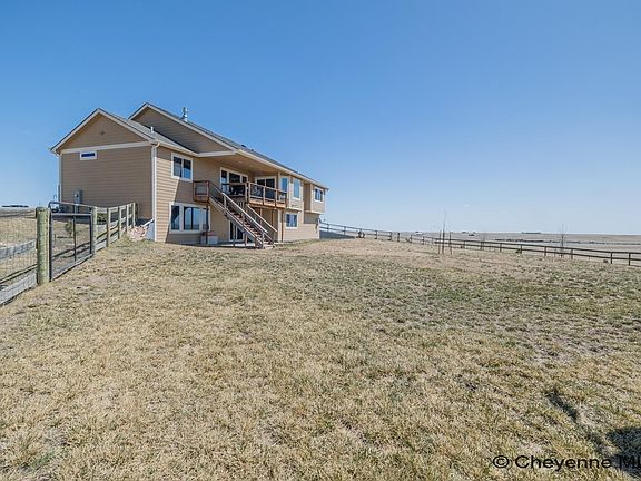 15.66 acres west of Cheyenne in a small, esteemed neighborhood, a paved road brings you to West Ridge Estates and this lovely home on the hill. The large windows and south facing deck soak in light and take advantage of the expansive views. The pastures surrounding the home are fenced and divided for grazing and provide room for your horses to roam. The horse barn provides easy shelter, and spacious stalls with heated water and hay storage. In the well-appointed kitchen you will find a “hidden” walk in pantry, just short steps from the large mud room laundry and garage for easily transporting staples. The finished walk-out basement and adjoining theater room await hours of recreation and relaxation. Covenants allow for six horses, llamas, or cows.