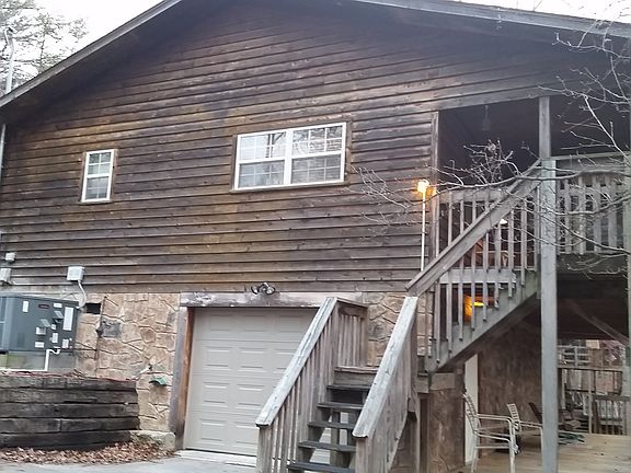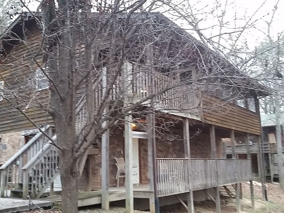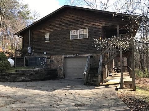 This cabin has a nice little front porch and large back deck. 1/2 of back deck is screened. Enter foyer and office is on the right, pantry/storage on the left. Just down the hallway opens into large kitchen area with island that open flows into dining area and living room and free standing wood burning fireplace. To the right is master bedroom with large on suite bath and walk in closet. Jetted tub and shower combo. On the left side of home is 2nd bedroom and another full bath. Pull Down attic in hallway. Basement has one car garage with remote door and a half bath, extra storage and work area and walk out to another deck. Extra large lot. One owner.