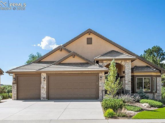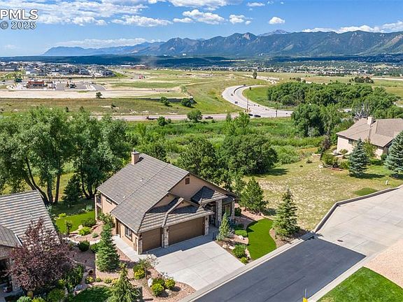 Nestled in the exclusive gated community of Brookmoor, this custom-built Hammer Home offers peace, privacy, and captivating Pikes Peak and Air Force Academy views—no rear or west neighbors in sight. A charming stone archway welcomes you into an elegant entry with hardwood flooring. Just off the foyer is a private office featuring built-in desk and cabinetry, plus a hidden 7x3 walk-in closet concealed behind a bookcase—ideal for storing valuables or converting to a future shower for the adjacent half bath. Across the hall, the mudroom includes built-in shelving, a utility sink, and direct access to the fully finished 3-car garage (19.7 x 29). The great room boasts hardwood flooring, surround sound, a corner gas fireplace with floor-to-ceiling stacked stone, and sweeping views of Pikes Peak and the Front Range. The adjacent kitchen is a chef’s dream with granite countertops, travertine backsplash with mosaic accent, gas cooktop, built-in oven and microwave, pull-out cabinetry, a large island with bar seating, and a walk-in pantry. The dining area, framed by a bay window, walks out to a spacious 30x12 covered composite deck—perfect for entertaining with unobstructed mountain views. The elegant primary suite features hardwood floors, 4" baseboards, and direct deck access. The adjoining bath includes tile flooring, a 4x5 walk-in shower with teardrop window, dual closets (3x5 and 7x9), a stackable washer and dryer, and built-in shelving. The finished walkout basement includes a generous 19x19 family room with 9-ft ceilings, a second gas fireplace with wood mantle and stone surround, a full wet bar, and access to a concrete patio. Also downstairs: a spacious utility room with plumbing for a second laundry area, a secondary bedroom with a garden-level window and attached bath with 4x6 walk-in closet, plus a 42x11 flex room with a bath rough-in and potential to divide into two additional bedrooms. A rare blend of comfort, quality, and mountain-view luxury.