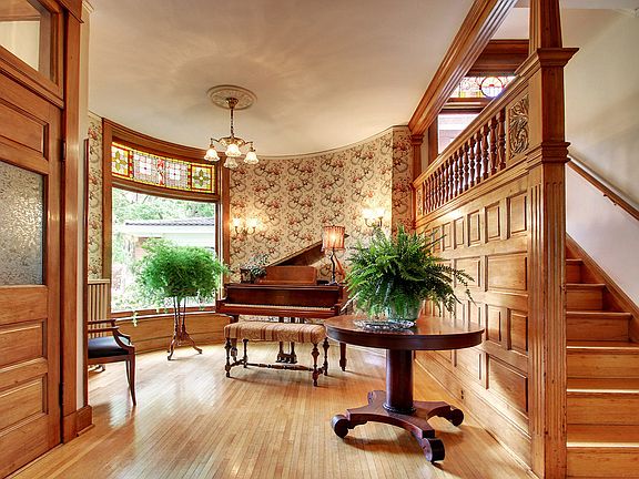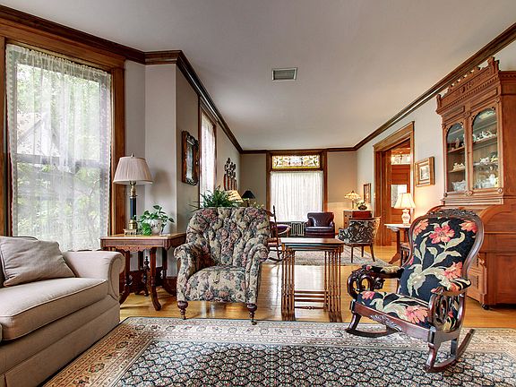 Stunning historical Queen Anne has an extravagance of butternut woodwork and custom stained glass. The kitchen has been tastefully remodeled and the yard is shaded and private. The driveway is shared. "Other" heat is hot water. "Other" room is butler's pantry. So impeccably maintained, even the electrical wires have been buried underground for protection from storms.