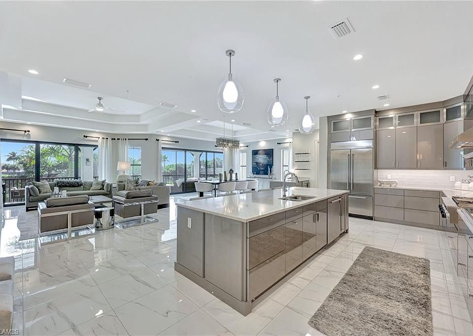 Large islandScreened lanaiDesigner finishesSouth-facing exposureAttached two-car garageCustom millworkSpa-like bath