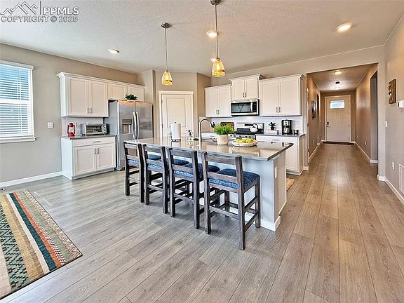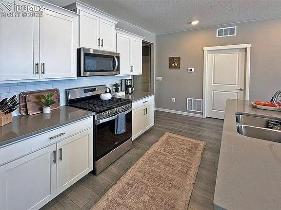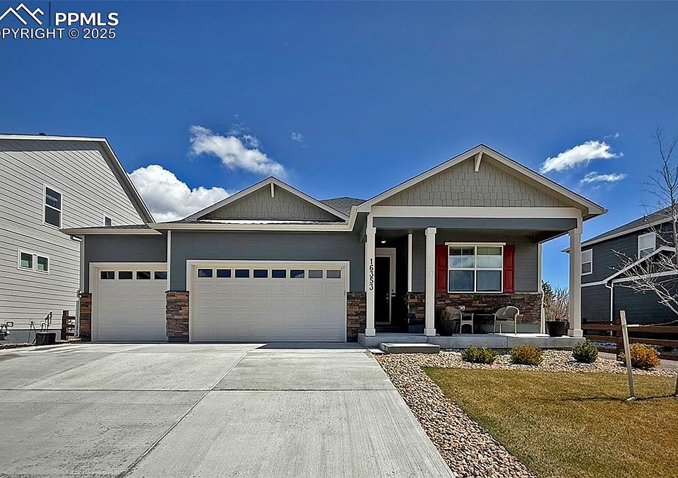 Better than new with completed landscaping! Mountain views surround the quiet & dark neighborhood of Willow Springs Ranch. This 3-bedroom, 2-bath single-level home has a spacious open floor plan and a massive unfinished basement with the potential to nearly double the finished living space. Plus, you have plenty of room for toys and vehicles with a 3-car truck-sized garage! The kitchen boasts quartz countertops, stainless steel appliances, and a gas cooktop for gourmet meals at home. The private master bedroom offers ample space, a generous walk-in closet, and a double vanity. Two additional bedrooms and a full bath provide space for family or guests. The home has updated light fixtures and ceiling fans in every room, and the internet modem hard-wired above the hall closet---no more scrambling to hide unsightly wires! With two hall closets and a landing area, you'll have plenty of space to store your winter gear. Watch the summer rains from the covered front porch while enjoying views of Mount Herman. The low-maintenance backyard offers an enormous 825 SqFt patio with views of Cheyenne Mtn. to the South - perfect for entertaining, stargazing, or sitting by the fire! Behind the property is the backside of a large acreage parcel and Metro District-owned easements on both the back and the side - so there's extra breathing room and the ability to access the property from behind, with views of mature trees and a meadow. The basement has the potential for 2 more bedrooms and is pre-plumbed for a bathroom with radon mitigation installed. High-end laundromat grade SpeedQueen washer and dryer for ultimate efficiency. Willow Springs Ranch offers 100+ acres of protected open spaces, scenic ponds, creeks, and trails to explore. Plus, you’re just minutes from Monument Lake, Fox Run Regional Park, and more activities like hiking, mountain biking, nordic skiing, Jeep trails, and the expansive outdoor lifestyle that Colorado has to offer.