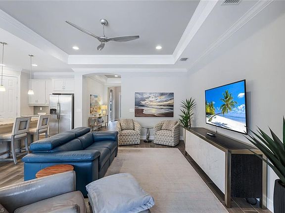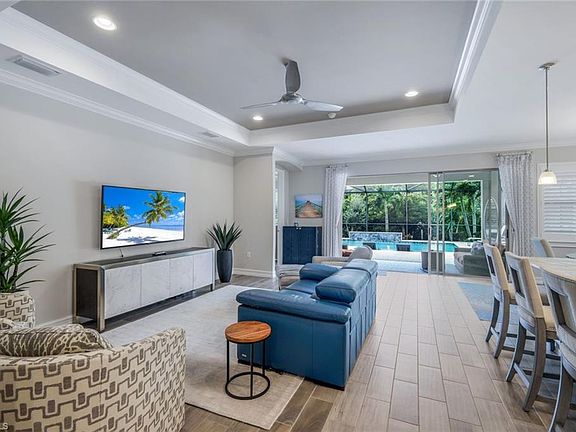 Unlock the door to your future home in Barrington Cove! This beautifully furnished pool home exudes elegance with its open layout and light-filled spaces. Distinct designer upgrades include tray ceilings in the foyer, great room, master bedroom, and bathroom, along with high ceilings adorned with crown molding. Plantation shutters grace all windows, complemented by custom curtains in the living area and high-end furniture throughout. Step outside to your own custom pool, featuring enchanting lights and surrounded by premium non slip pavers. Pool can be controlled via app. Electric screens in the lanai for ultimate comfort. The primary suite features two walk-in closets, an ensuite bath with dual sinks, a soaking tub, and a walk-in shower. This meticulously clean home is situated in a gated community within a great school district, just a short walk to Veterans Memorial Elementary and a brief drive to Seed To Table. Enjoy close proximity to Mercato and the famed sandy beaches of Naples. This home is poised to welcome you to a life of comfort and style.