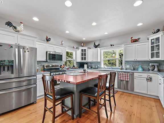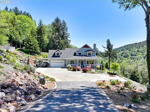 A trip down a magical country rd to this meticulously maintained private country estate w mountain,valley & territorial views.This beautiful country home overlooks an enchanted forest filled w/Redwoods,Dougfir trees,Myrtle trees & multiple creeks.This traditional country home will capture your heart as you enter through the Mahogany front door into the living room to a Sitka Spruce open beam ceiling,Tan Oak flooring,a wood stove to warm you on those cooler days & nights.The open & spacious kitchen featuring s/s appliances,mahogany cabinetry finished in white,solid surface counters,tile backsplash & madrone floors.The eat in kitchen has an island bar & separate table for breakfast, casual dining & or entertaining.Formal dining is adjacent for those special guests,family & friends.During the day natural light fills the kitchen & the recessed canned lighting supplies the correct amount of light.Hall pantries & an office just off the kitchen w/a generous amount of built in cabinets,a murphy bed for guests.The laundry/mudroom w/a generous amount of cabinetry & sink leads from the hall to the expansive garage.The 3rd bedroom/guest room is just to the left of the main entry adjacent to a full bath. At the front entry a beautiful Doug Fir Staircase ascends to the second floor where the primary suite awaits you.A large room with incredible views,step out of the slider & onto deck & enjoy the beauty of the surrounding nature.In the washroom there are dual vanities,jetted tub,walk in shower,commode & walk in closet, all with views. Down the hall to the 2nd bedroom & large bonus room over the garage.Take in the outdoors & get the lay of the land from the wrap around covered deck. Entertain on the patio or immerse yourself in the greenhouse &/or potting shed. A 24?x50? pole building to protect valuables from elements. Cultivate the fenced area protected from nature feeding on your harvest. A fenced area w/chicken coup & raised bed garden to cultivate your own fruit & Vegetables.