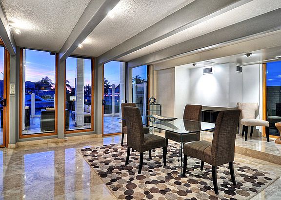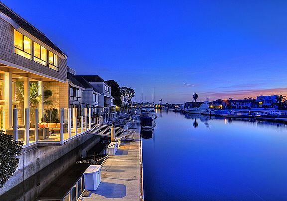 Stunning waterfront Huntington Harbour home in the private and gated Tennis Estates. Highly upgraded, well-maintained attached single family home boasts unobstructed views of the bay and a private 40 ft boat dock. With three bedrooms and three and a half bathrooms, this 2800 sqft tri-level residence exudes elegant seaside living with luxurious amenities. Upon entering through the beautiful custom stained glass door, you are greeted with an open view of the harbour and glass windows that span two stories. Large downstairs family room and entertaining area features a cozy fireplace, is wired for surround sound and has a built-in media center that houses a full entertainment system. A mini bar refrigerator, wine cooler, and wine rack complete the custom wet bar. The kitchen is a chef’s dream featuring beautiful granite counter tops, stainless steel Viking appliances including a built-in Subzero refrigerator, built-in microwave, an oven and warmer oven drawer, a walk-in pantry and even a dumbwaiter system! All bedrooms located on the third floor with the ensuite master bedroom boasting gorgeous views of the bay, a spacious walk-in closet, a steam shower and a separate tub. Bright natural light and custom track and recessed lighting throughout the home.