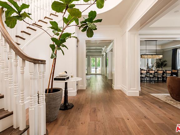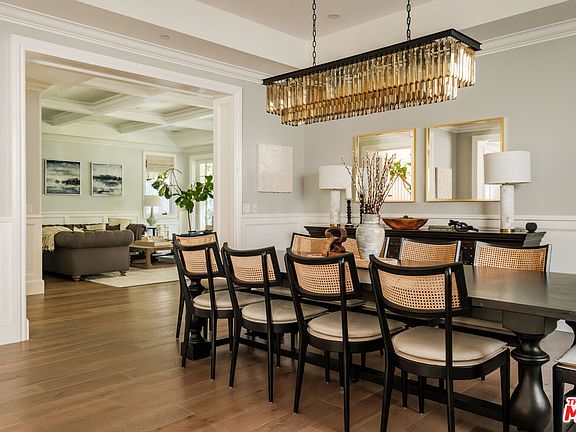 Set within one of Westwood's most coveted neighborhoods, this exquisite custom-built residence blends timeless traditional architecture with modern luxury. Spanning over 5,000 square feet, the home welcomes with warm wood floors, bespoke millwork, and coffered ceilings that exude sophistication and craftsmanship at every turn. The formal living and dining rooms provide convenient access to a wine cellar, creating an ideal space for entertaining. Just beyond, the sunlit family room opens through French doors to a covered stone patio with an exterior fireplace, for effortless indoor-outdoor living. At the heart of the home lies a gourmet chef's kitchen, adorned with striking stone countertops, a seated island, and premium appliances, including a Wolf gas range and double ovens. The space also boasts a full-sized refrigerator and freezer, abundant pantry storage, and a charming breakfast banquette overlooking the backyard. Ascend the curved stairway to the expansive primary suite. This private sanctuary impresses with vaulted ceilings, a balcony, and dual custom walk-in closets. The spa-inspired en suite bath is a serene retreat with dual vanities, dual separate water closets, a glass-enclosed shower, and a luxurious soaking tub. Find three additional bedroom suites upstairs, plus one conveniently located on the main level, providing flexibility for guests or use as an office. Additional amenities include a powder room on the main level, built-in surround sound, and solar panels with three Tesla batteries for sustainable living. Outside, the lush backyard is enveloped by mature hedging and features a covered patio, built-in BBQ, sparkling pool and spa, and a spacious lawn for relaxation or play. Secured behind an automatic driveway gate is an attached two-car garage with newly epoxied floors and direct access. Ideally situated just moments from top-rated schools, Holmby Park, Westfield Century City, and Westwood Village, this remarkable home offers timeless sophistication, comfort, and convenience for the very best of Westside living.
