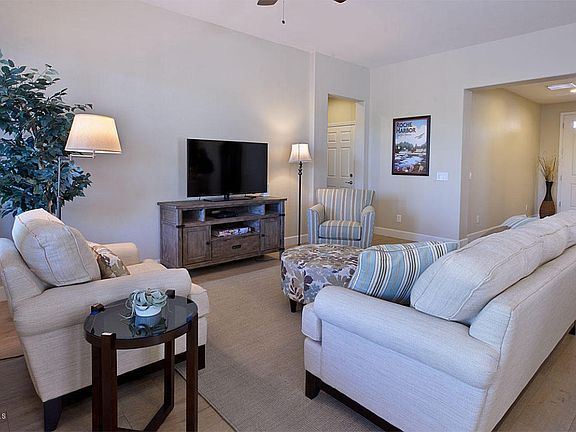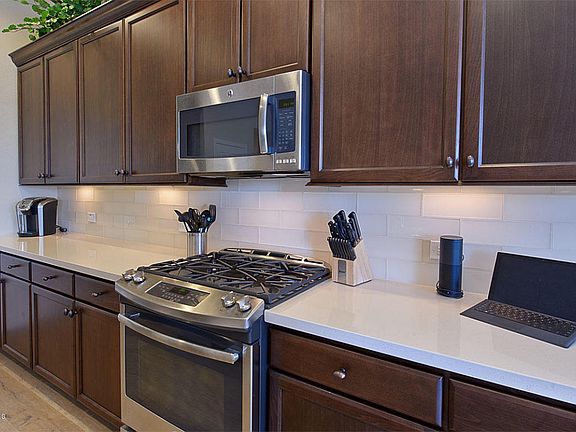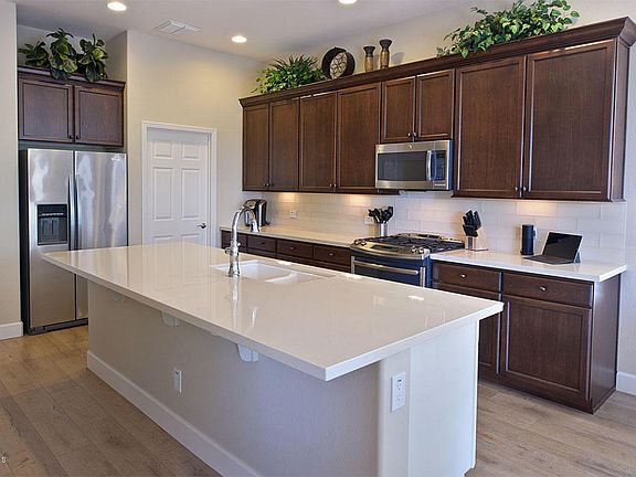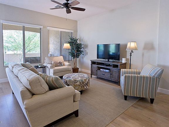 Excellent Value! Superior Lock & Leave Villa Location! Ready for you to enjoy this Spring. Private South facing back yard with extended pavered patio; the perfect place to soak up the Arizona sunshine! Kitchen upgrades include: beautiful upgraded cabinetry with 42-inch upper cabinets & roll-out shelves, pantry, quartz counters, glass tile backsplash, undermount Kohler sink, STAINLESS STEEL appliances including gas range, Over the Range built-in microwave, refrigerator, & dishwasher. Spacious laundry room has extra cabinets; washer/dryer included! Stunning wood laminate flooring, upgraded carpet in bedrooms, and tile in bathrooms. Additional upgrades include: Nuvo tankless water softener /filter, window coverings, & upgraded lighting. Move in & enjoy the PebbleCreek resort lifestyle now!