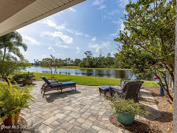 Waterfront Beauty in a gated community in West Melbourne! 3BR/2 BA home situated on a gorgeous lot in that overlooks the water! The minute you walk in, you will love the feel of this home and the flow! The spacious kitchen overlooks the family room with a large breakfast bar, LG SS appliances- double oven w/ convection, granite countertops, and a pantry w/ custom built-ins. The laundry room offers custom cabinetry & includes a GE washer/Dryer. The owner's suite is lovely, with a custom built-in closet system in the walk-in. The primary bathroom offers double sinks, a custom vanity area that is charming, and a walk-in shower. As you walk out onto the trussed patio, you will fall in love with the waterfront setting w/ the custom pavers! Excellent location, w/ easy access to all your needs.