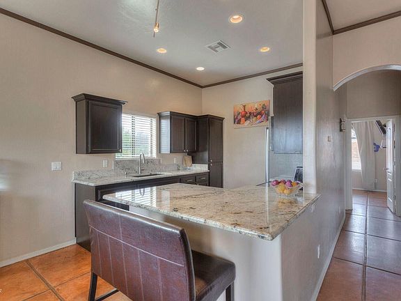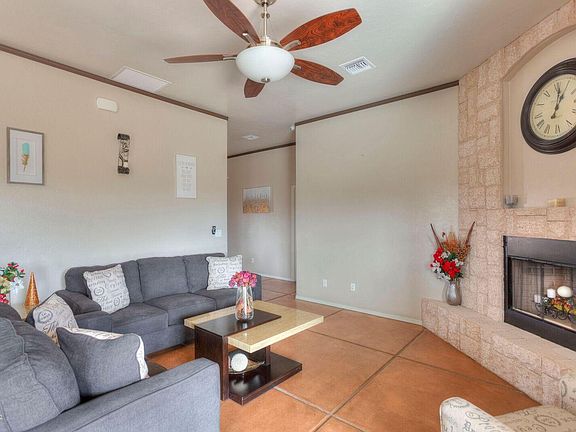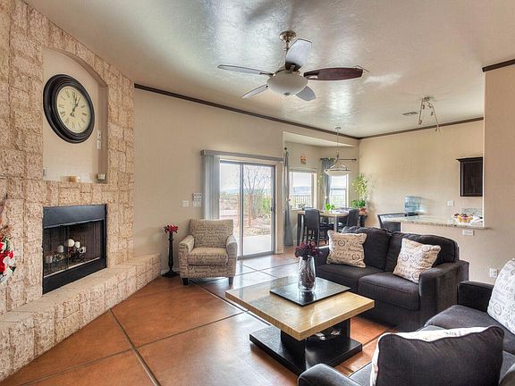 Easy exit to FWY. Newly painted, stainless steel appliances. Granite counter tops in kitchen. Beautiful concrete flooring throughout the home. Living room has light-colored stone wall with fire place giving it a cozy feel. A spacious laundry room. Bathroom's has natural tile counter tops walk in showers. Garden tub in master bathroom. Clear glass bowel sinks. This home has the perfect back yard for those family and friend get together. Built in stucco fire place located in the back yard. Nice covered ramada area. A fire pit with large boulders for sitting. Panoramic views. This lovely home is surrounded by trees and plants with a drip system that was done manually. It's the perfect home for you