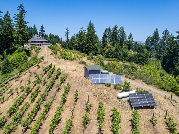 You ever wonder what it's like to relax on your 360 degree porch, coffee in hand, watching the fog roll in on the valley floor below like a river? Or maybe you prefer just knowing you have left the buzz of the power lines behind as this off grid paradise is only minutes from town, yet still run on solar. This dreamy custom home was built with care and is not your typical house on the hill. Once the home of the Terragena Vineyard, this former AirBnB is the bees knees. The vineyard is ready for you or sell the grapes to a local winemaker. The pond, with more dragonflies than I have ever seen, is where you will find me, sitting on my laptop because this property has high speed internet! The views will take your breath away. Don't let this one slip by! Call now.