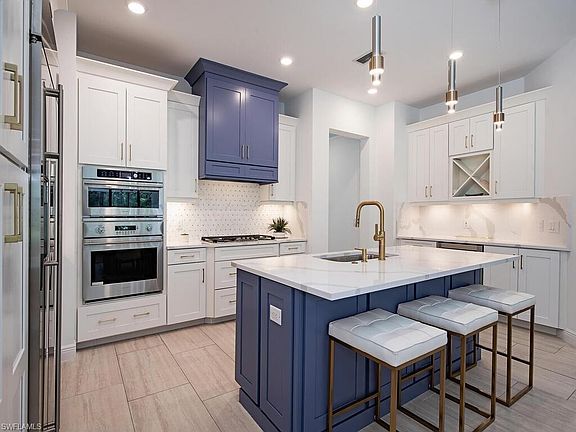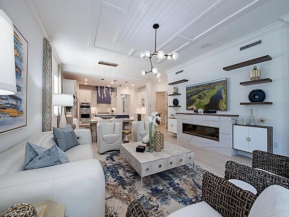 Beautiful Talis Park condo built in 2019 with luxurious upgrades & an immediate golf membership available so you can skip the wait and enjoy the newly renovated golf course designed by Greg Norman & Pete Dye. The spacious 3 bedroom+den 3.5 bathroom condo includes a private 2-car garage & features 10’3” ceilings & a semi-private elevator that opens directly into your home with 2350 SF of interior living space & an additional 230 SF of outdoor living including a south facing screened-in lanai & balcony. The numerous upgrades include architectural wood walls, shiplap, double stack ceiling molding, built-in cabinets in the den & living room, including fireplace, designer lighting, unique plumbing fixtures, elegant gold & white kitchen backsplash, & floor-to-ceiling custom draperies & valances. This unit is being offered with decorator Robb and Stucky furnishings for sale upon request. Enjoy close proximity to the 3-acre Sports Complex with 2-lane lap pool, 4 bocce courts, grill, kids playground, 5 Har-Tru tennis courts & 4 pickleball courts. Talis Parks “Vyne House” was voted Clubhouse of the year in 2016 by Golf Inc. Talis Park offers private bus shuttle service to Vanderbilt Beach!