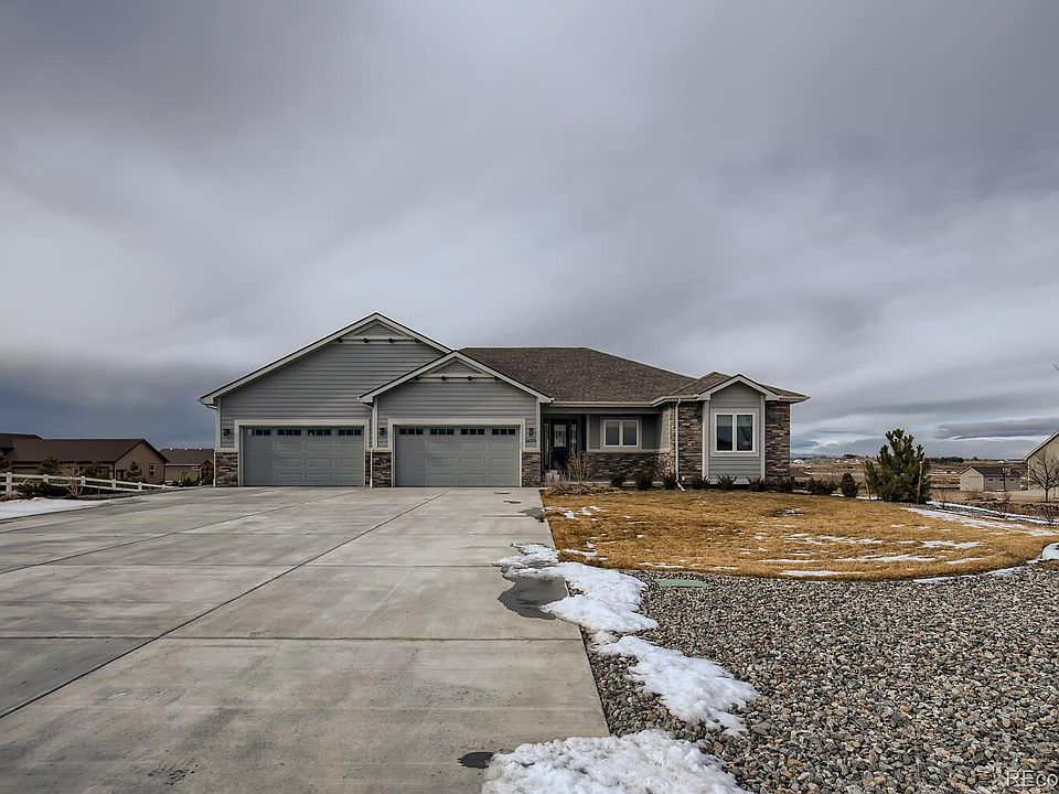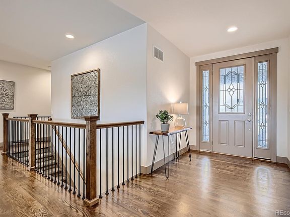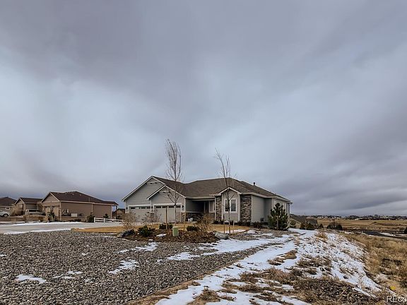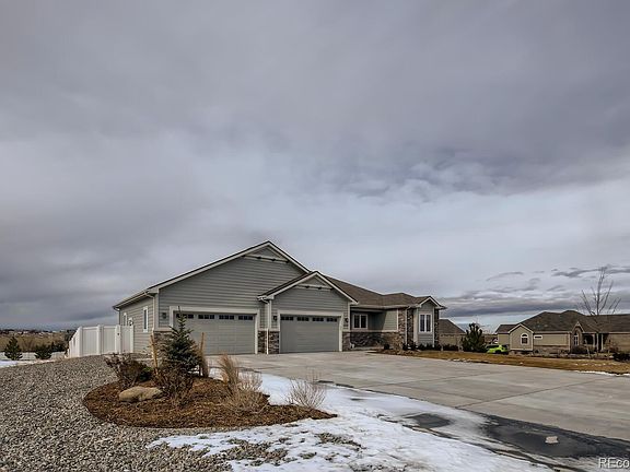 This 3 bed/2 bath walkout ranch on a 1-acre lot, with "unbelievable" mountain views, lives like new. Superior upgrades throughout. The vaulted family room is open and has universal design appeal. West-facing windows, gas fireplace (pre-wired for blower) and mounted TV make this an easy place to gather. Chefs will give the kitchen a thumbs up! Huge island, upgraded stainless appliances (Smart oven & Smart refrigerator), 5-burner gas stove, double ovens, microwave, soft-close cabinets with pullouts, under cabinet lighting...and once again...views. Master suite has a private bath with an extra-large shower, floor to ceiling tile surround, double sinks and walk-in closet. Large secondary bedrooms and full bath, complete with upgraded tub and all the upgrades found throughout the rest of the home. Main floor laundry with utility sink and cubby area. Extra-wide doors throughout. High-quality trim work. High-quality windows (with interior screens). Top-down Roman shades (lets in light/offers privacy). Slab granite throughout. Open staircase to unfinished walkout basement that has great potential, incredible light and 9-foot ceilings. (Electrical planel in basement has enough open circuits to finish the basement.)Phenomenal outdoor living space. Composite deck, fully fenced and professionally-landscaped yard. Lower-level patio with 55-inch SunBrite TV, hot tub (in excellent condition) and planter boxes for that summer garden. You will LOVE the "finished" 4-car oversized garage (nearly 1,500 sf) with high ceilings, electrical panel and extra lighting. Paved driveway (big enough to be a small runway!) Fully irrigated (front and back). Ring doorbell and cameras stay. Undoubtedly one of the best lots in Box Elder Creek Ranch...You truly get a "Queens View" of the mountains, especially with Colorado's 300 days of sunshine. Don't miss out. Schedule your showing today.