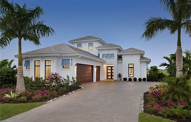 Harbourside Custom Homes is offering residences in Talis Park's Corsica neighborhood. The two-story, 3,672-square-foot Villa Adriana II model is open for viewing and showcases an interior by Clive Daniel Home's Rebekah Errett-Pikosky and Charlie Hansen. The first floor includes a great room, island kitchen, and dining area that open to the outdoors, a master suite, two guest bedrooms, and a study. The kitchen features a wine bar, KitchenAid appliances, granite counter tops, and a walk-in pantry. Upstairs offers a fourth bedroom or second study, and a bonus room that opens to a covered balcony. The outdoor living area features a summer kitchen, a fireplace, and a pool and spa with a screened colonnade. The plan includes a three-car garage.
