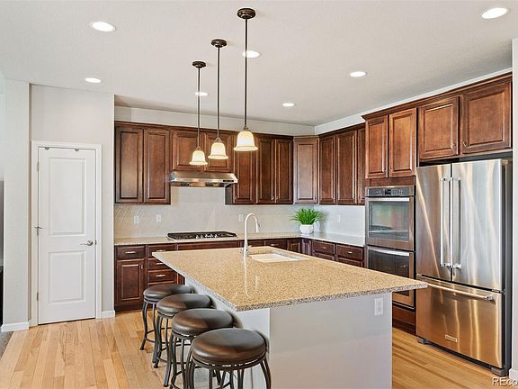 - Description: Hickory Wood Floor, Island Seating, Pendant Lights, Pecan Cabinets, Stainless Apps