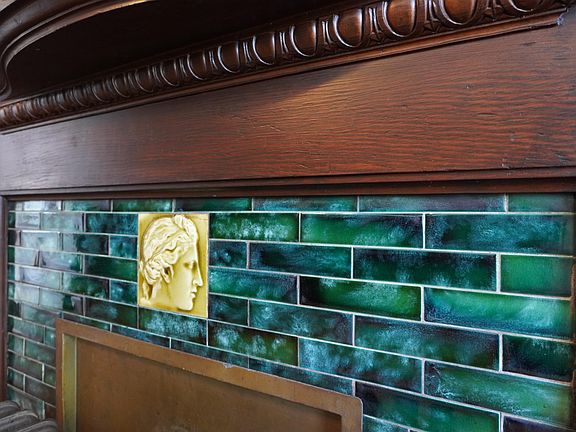 Formal dining room is a trove of gorgeous details including a decorative fireplace with stunning original tile, built-in buffet, box-beamed ceiling, and a stained glass window.