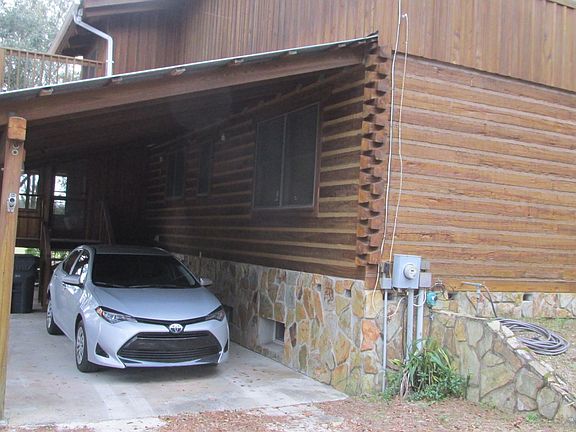 Country living in this unique custom built 2 Story Cypress Log Home with full basement creating 3 stories situated on over 4 acres just minutes from I-4. Relax on your open front porch and enjoy the view of a park like setting. Soaring knotty pine ceilings and exposed beams enhance the Living Rm, Den and Dining Rm which all flow as one long, but separate space. The stone faced wood burning fireplace with raised hearth complements the spacious open design. This home features exterior wall through-bolt design, pine floors, Anderson thermal pane windows, custom built thermal pane french doors, metal roof, 2015 heat and air system with heat pump, well tank replaced in 2014 and updated drain field in 2013 for the main septic system. The Master Bedroom boasts a balcony/sun deck and shares a large cedar walk-in closet with the adjoining 2nd Bedroom. Luxury jetted tub, open tile shower and dual sinks define the Master Bath. Peak through open concept allows the 2nd floor bedroom occupants to enjoy the dramatic ceilings and open beams below. Clerestory windows provide an abundance of natural light. The basement offers multiple possibilities including one finished room with dropped acoustical tile ceiling. Exterior access via a doorway to the covered carport area enhances the open unfinished space. A large (40x14) detached workshop storage building adjoins a metal carport cover designed for RV parking with its own septic hookup, Original owner, blueprints and boundary survey available. Sold As Is..