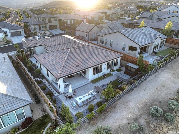 Absolutely Stunning, model home like with numerous upgrades throughout | Gorgeous views and open site-lines from backyard including views of the Truckee river | No rear neighbors | Gated community | Single-level floor plan with 10’ ceilings | 3 Bed / 2.5 Bath | Quartz kitchen countertops, stainless steel appliances, under cabinet lighting, upgraded interior lighting fixtures | Brand new motorized and cordless window coverings throughout entire home | Custom built-out master closet with glass doors + shelves, Upgraded mirrored closet doors in all bedrooms | 65” 8-blade ceiling fan in living room | Carpets freshly steam cleaned | Gas fireplace | Alarm pre-wire | 3-car tandem garage | Commercial grade epoxy garage floors | Crawl space foundation. Custom European outdoor traditional sauna (dry heat and steam) with panoramic views | Bull Frog STIL 5 hot tub with brand new CoverMate III hydraulic cover and lift | Outdoor kitchen with granite countertops, refrigerator, gas stove and BBQ Grill unused | 3 firepits | European pavers | Low voltage lighting in backyard | Large courtyard with keyed entry gate | Brand new fence and gate with double locks, no gaps, oil-based stain | Low maintenance front and rear yard with lush landscaping | This home is in spectacular condition, turn-key and move-in ready! Stainless steel Samsung TV refrigerator, washer and dryer combo, additional OLED TV’s with interior and exterior furniture optional with purchase of home. Neighborhood streets and Somersett parkway freshly paved and striped. Walking accessibility to an abundance of trails, community parks or enjoy all the amenities the Clubhouse has to offer such as fitness facility, indoor basketball court, outdoor swimming pool, restaurants The Grille, Peavine Taphouse, Sakana Japanese restaurant, located within the 18-hole championship golf course community of Somersett. This could be your primary residence or second home for out of State buyers seeking a vacation home or residence in the State of Nevada where there is zero State Income Tax. This is the ONE for you!