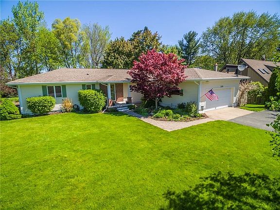 Spectacular Penfield ranch updated to perfection with over $100,000 of stunning improvements! NEW maintenance free exterior, NEW Anderson windows, & tear off roof! Beautiful interior - arts and crafts design - NEW everything including: Gas Fireplace Great Room-built in cabinetry, quarter sawn oak floors that opens to cook's kitchen-maple cabinetry, Corian counters, stainless steel appliances & cork floors! Family room-large office with built in cabinets & antique double pocket doors! Sun room with recessed tray wood ceiling & covered porch & country views! Two updated bathrooms one with a laundry, three spacious bedrooms including a master all with hardwood floors. This is one floor living at its best! Half acre of beautiful landscaping -28 x 26 two story out building! AMAZING VALUE!