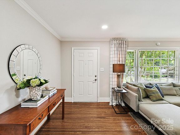 Enter into a welcoming formal living room filled with natural light, featuring large windows and a gas log fireplace. Just around the corner, discover a surprisingly spacious open-concept layout connecting a bright sunroom and a chef’s dream kitchen. The kitchen is beautifully updated with quartzite countertops, KitchenAid ss appliances, gas cooktop, and Vent-A-Hood range hood.A large center island provides ample prep space and seating.The adjoining sunroom offers character and function with custom built-in cabinets. Retreat to the comfort of the primary suite, complete with a tiled shower and soaking tub-a rare feature in this neighborhood! Step outside into your private backyard oasis. A large stone patio, mature landscaping, and ambient evening lighting make it ideal for entertaining.The fully fenced yard includes a 12x12 storage shed and a vegetable garden.Neighborhood access to the CLT Greenway system & “Backyard” MTB trails.Convenient to SouthPark, PRSC, Uptown, and CLT airport