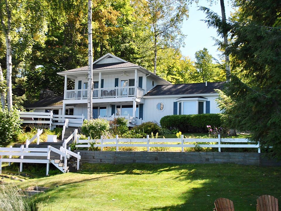 IMPECCABLE, 4 BR, 3 FULL BATH LAKEFRONT HOME on 120' of all-sport Big Lake in Gaylord. Beautiful treed property, tremendous lake views from large deck, nestled on quiet cove. Open plan, stone fireplace, vaulted main floor master suite, covered porches, many upgrades, Brock dock system, 2 car garage and more!