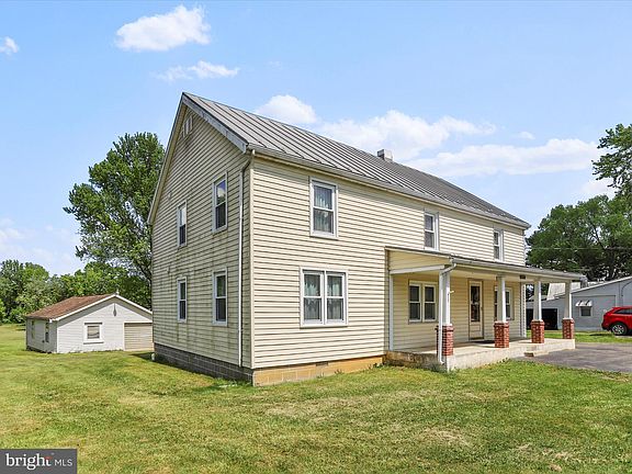 Main level features a living room, a den/study, kitchen with eat in table area, dining room, family room, full bathroom(tub/shower combo), a separate laundry area and a rear enclosed porch for your entryway/mudroom. Upstairs has 4 bedrooms(one with a walk-thru room which could be used as an office/extra sitting area, etc.) and a full bathroom(tub/shower combo). Attic has a wooden floor perfect for storage needs. Extra-large detached garage with space for workshop and storage. Other barn area for animals. SOLD AS -IS.