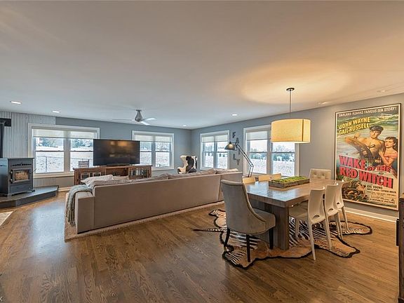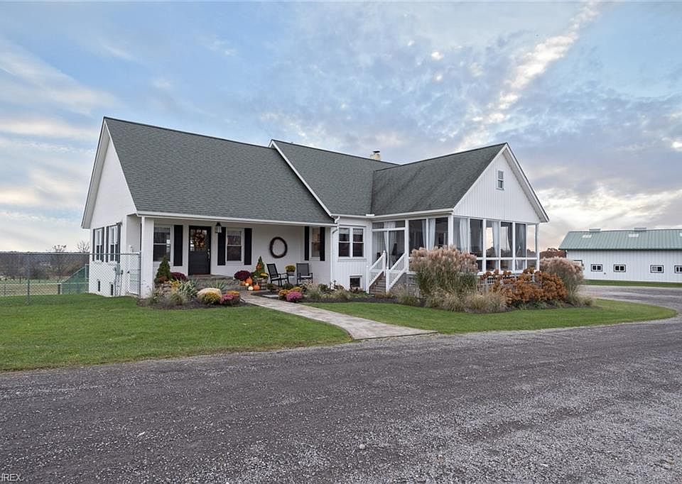 Tucked away on 11+ serene acres, this beautifully restored farmhouse is just waiting for a new owner. Highlights include a gourmet kitchen, a luxurious master suite, and high quality, Amish made fixtures and finishes throughout, plus a multi-stall horse barn and an outdoor riding ring. The front patio opens to a spacious great room with refinished hardwood floors and a pellet stove. Step up to the stunning kitchen with top-of-the-line appliances, an oversized natural stone island with a wolf range, and custom made cabinets. The kitchen is open to a cozy hearth room with a stone fireplace. Off of the hearth room, there is a gorgeous three-season sunporch. A first floor full bedroom and ensuite bathroom with a reclaimed wood vanity and closet complete the main level. Upstairs, you will find two bedrooms that both enjoy ensuite bathrooms, including the master suite with two walk-in closets. Both bathrooms feature quartz countertops, custom-made reclaimed wood vanities, and slate floors. The walk-out lower level includes a fourth full bathroom, a laundry area, and a large mudroom area that opens out to a covered patio. The 11.9 acre setting also includes a, multi-stall horse barn, heated tack room, an outdoor riding ring with GGT footing, and plenty of pastures, including a dry pasture. Located in Huntsburg, close to Headwaters park and the 18+ mile Maple Highlands bike trail. Located five minutes from Middlefield and five minutes from Burton!