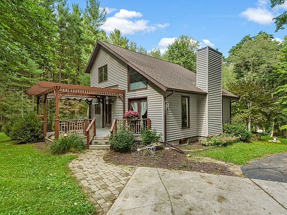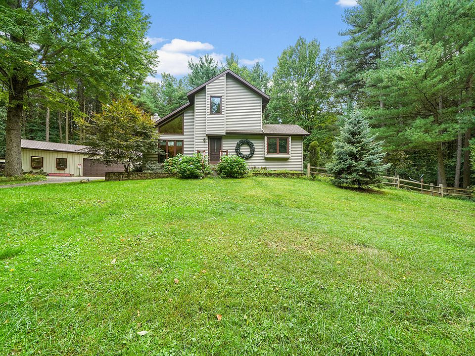 The peace, quiet and privacy are enhanced by the tree lined driveway leading up to this custom home that was built with love by owner. Home has an impressive open kitchen w lots of cabinets & lovely flooring that flows in the living room. Sloping ceilings & extra windows provides the airy feeling which strikes you from the moment you enter. The first floor master has slider that opens to private deck. 2 nice size rooms are upstairs w full bath. Finished basement offers family room, laundry, storage and room with egress window (Could be 4th bdrm w wall & closet added) There is a 30x48 garage /outbuilding that offers 18ft overhead door. workshop w wood burner & tons of spaces for vehicles and toys. All this & just over 9 acres. Home is not visible from road. Please schedule appt to vie