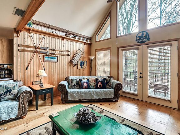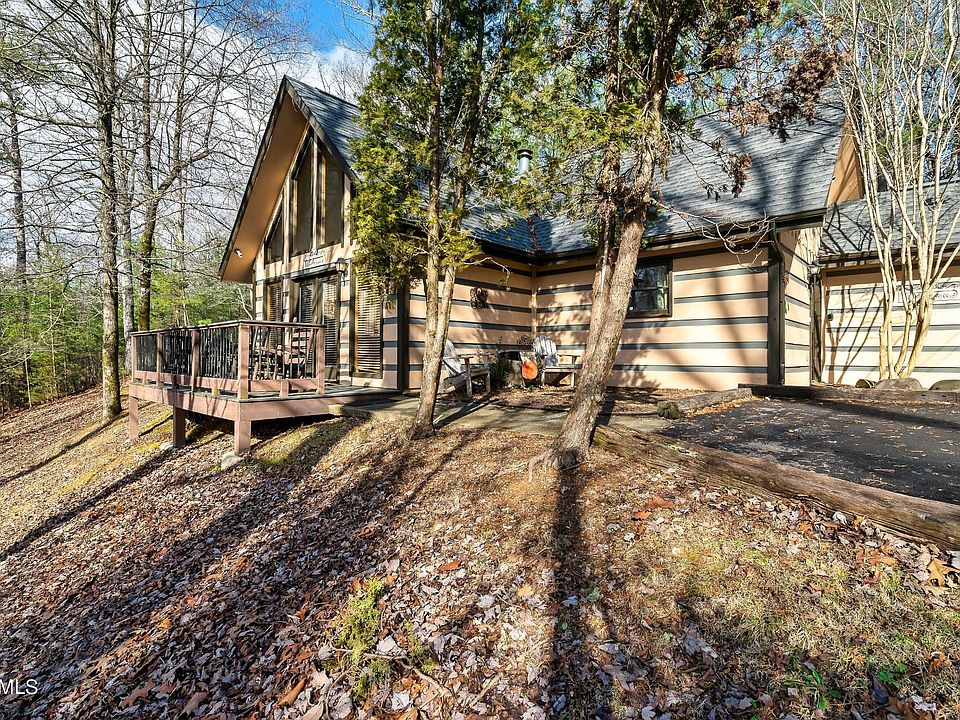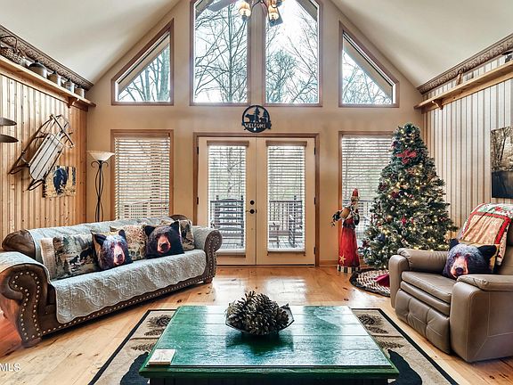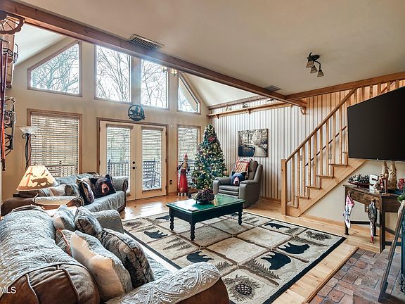 Peaceful sunsets in the Smokies highlight this handsome Mountain Cabin. The great room is a rustic retreat with cathedral ceiling, cozy fireplace, and a wall of windows with French doors to easily access the oversize deck. The kitchen features a large island, unique brick floors, and an adjoining dining nook. The main level offers a King bedroom with an ensuite bath, walk-in shower and French doors for access to the deck. Upstairs are two bedrooms with vaulted ceilings that share a reading nook overlooking the great room. Outside is an exceptional amount of deck space for grilling, hot tubbing, and enjoying the peaceful tranquility, plus firepit for all to gather round. Mountain lodge decor, a great central location, and easy parking with a newly paved driveway, no steps to entrance.