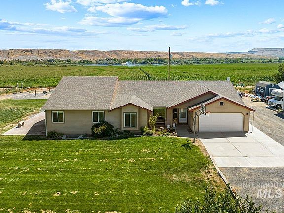 Beautiful 5 bed, 3 bath home sitting on 5 acres. Everything you need and more! Located in highly desired Melba Idaho, home sits on 5 acres . This is an amazing property. This home boast over 3400 sq. ft. Open floor plan with office on main floor. with an attached 2 car garage. Separate 25x30 ft insulated shop with propane heat and 11 ft tall bay door. Basement has tons of storage and awesome bonus room! Spectacular views of the Snake River right off the covered back patio. Bring all your toys and animals! Huge pasture, fruit trees, plus private road to your home. Water rights included. Average power bill is around $10 per month due to the Solar tracking system that has been installed and paid for by the sellers! Just down the road from multiple BLM trails and boat access to the Snake River for all your hunting and fishing desires. Don't miss out on this fantastic opportunity to own your own piece of Idaho paradise!