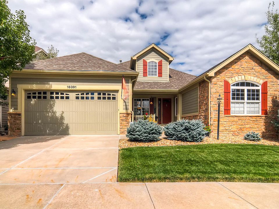 Gorgeous rare South facing ranch model in Stonegate located on a cul-de-sac with an open and bright floor plan. Neutral colors with a gourmet kitchen, slab granite counter tops and custom back splash, stainless steel appliances, double ovens, lots of storage with pull out cabinet drawers and a butlers pantry. Formal dining room, open family room with a newly tiled fireplace surround and 3 bedrooms up. The huge finished walkout basement has 2 bedrooms and a bath. A wet bar with a mini fridge rounds out the large living space in the basement while leaving plenty of space for storage or a shop area. A 3-car tandem garage, 3 year old exterior paint and great access to E-470 and the airport. Walking distance to elementary school and high school. Stonegate is a much sought after community and ranch floor plans are very rare. Come experience this beautiful home for yourself.