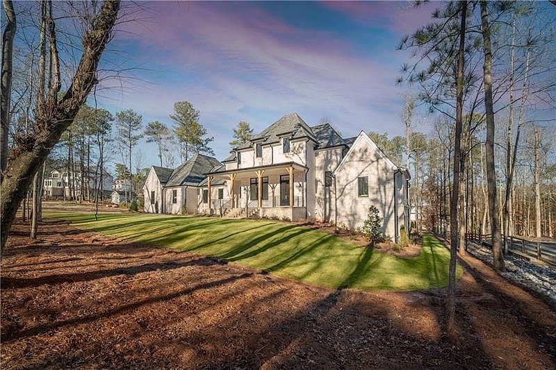 Stunning New Construction! This "French Country Estate"-inspired home has been thoughtfully designed in elevation and floor plan on a stand-alone 1+ acre with no HOA. This alluring new home offers a spacious, modern design with bespoke finishes and outstanding craftsmanship. Entertainers delight with this desirable floor plan featuring a welcoming covered front porch with double door entry. A truly impressive foyer highlighted by a feature wall and flanked by a lavish dining room with an alluring Butler's Pantry is a captivating entry point leading to the central space that seamlessly combines the gathering room, kitchen, and family room that all set the stage for this fabulous lifestyle with designer touches throughout. Highlights include 12" ft ceilings on the main, all custom cabinetry, modern accent walls, custom light fixtures, tons of natural light, stunning black framed Pella windows, gorgeous White Oak Hardwood floors throughout the 1st & 2nd levels, Quartz & Honed Granite counters throughout, and wood and iron stairwell. Relax in the living room beside the cast stone fireplace with access to the large covered back patio and enjoy cooking in the outdoor grilling kitchen with direct access to the backyard. A well-appointed main-level private owners retreat with a sitting area and trey ceiling is privately located off the living room vestibule. It features a stunning marble spa bath with a stand-alone tub, a large walk-through shower with dual shower heads, dual vanities with light mirrors, and a sizeable custom-organized closet that will not disappoint! There is an additional bedroom suite on the main level with a full bath and walk-in closet, which can also serve as a private study. A beautiful Chef's kitchen is open to the living room & family room with a cast stone fireplace and room for an eat-in kitchen dining area, a beautiful beverage serving bar, a High-end appliance package with a 48" gas range, a side-by-side Sub-Zero refrigerator, a large center island with waterfall edge honed granite & Quartz counter and a second-serving wet bar with an ice maker and beverage cooler. The scullery kitchen will delight you with a steam oven, microwave oven, prep sink, Quartz counters, and custom-organized pantry storage. The main floor laundry room has beautiful Terrazzo tile flooring, custom cabinetry, additional refrigerator, utility sink, and utility storage. A large mudroom/home office room with storage cabinets and cubbies is off the garage entry. Upstairs boasts 3 large bedroom suites with ensuite bathrooms, large walk-in closets, and a bonus room at the top of the landing with two storage closets. A 2nd Laundry room with Terrazzo floors, custom cabinets, Quartz's counters, and a walk-in attic to access the home systems with spray foam insulation walls and roof. The garage ceiling is 12"ft and will accommodate 4 cars and a workshop. Easy access from the main level to the backyard, mature trees for privacy, and a significant lawn area with room for a future pool. Full preplanned daylight basement is ready to customize for additional living space & square footage. This beautiful new home is conveniently located only minutes from fabulous farm-to-table local restaurants, chic boutiques, shopping, Milton parks, award-winning North Fulton Schools, downtown Crabapple, Alpharetta, Avalon, and GA400!!