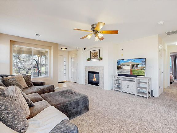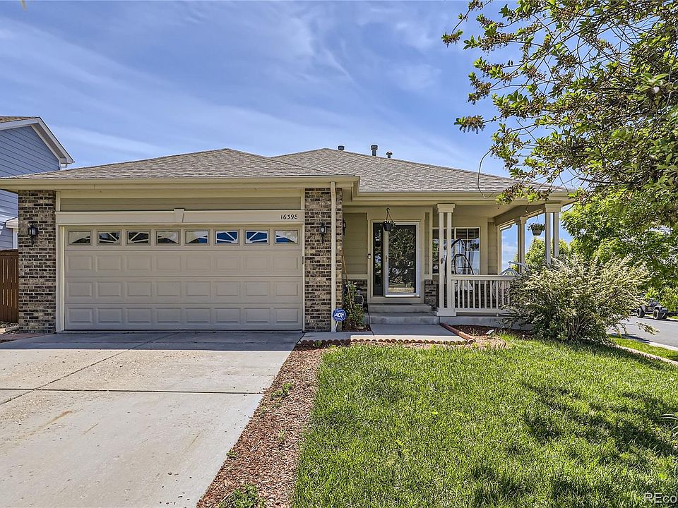 The living space is maximized with an open floor plan and enhanced by tons of windows, showing off the relaxing mountain views. The tile entry gives way to a bright and airy family room, which features a cozy gas fireplace, an art niche, and new carpet. The large archway to the dining area continues the open concept while smartly defining separate areas. From the bay window in the dining area, you can admire the mountain views, the beautifully landscaped backyard, or the lavishly upgraded kitchen, which sits on the other side of the breakfast bar peninsula. Not to be excluded from the open theme, the kitchen is larger than many in the bigger homes nearby. With ample storage and counter space, the kitchen features granite counters, upgraded shaker cabinets, and a beautiful extended backsplash. The new carpet continues from the family room, past a good-sized secondary bedroom and full bath, into the primary suite. This private retreat, with its own bathroom, features a long granite vanity, dual closets, a ceiling fan, and lots of natural light. Outside, you can enjoy the neighborhood from the covered front porch or relax under the pergola on the large back patio. This home has a fun pond complete with fish, surrounded by amazing landscaping just waiting to bloom. Buffalo Mesa has its own 8-acre park with a pool, a playground, & you are close enough to enjoy the Reunion Park & Coffee House, but without the high taxes of Reunion! Great location across from the park at a K-8 charter school, near an award-winning golf course, open space trails, retail shops, 2 rec centers, King Soopers superstore, & the Prairie Center Shopping District. Easy commute to Downtown, with less than a 30-minute drive, or the airport 15 minutes away. Some of the extras include all appliances, a freshly stained fence, roses, lavender, & more! Amazing opportunity for a starter house or downsizing, this affordable home sits amongst more expensive houses in the desirable Buffalo Mesa neighborhood.