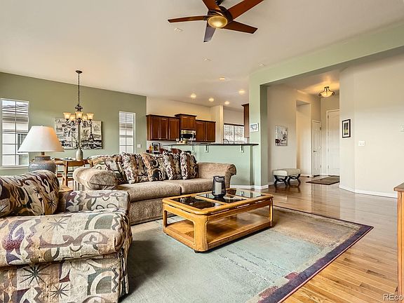 Views ,views and more views from this Anthem Ranch 55+ home! Located on a perfect lot with unobstructed mountain views, walking distance to the Aspen Lodge, pickleball and tennis courts. This home has been meticulously kept and offers true outdoor Colorado living with a large deck, electronic shade cover and newer deck and wrought iron railings! 2 bedrooms plus a large office with murphy bed so could be a 3rd bedroom. Open floorplan with tons of ight and great features. Extended hardwood flooring throughout the main level, eat-in kitchen, breakfast bar and separate dining room. The Maple cabinets have rollout drawers and the kitchen has many work station areas. The spacious living room adjacent to the kitchen offers a cozy gas fireplace, lots of windows looking out to the open space and mountains. Like privacy? This is your home with no backyard neighbor and green space and trails adjacent to the property. The primary bedroom offers a large walk in closet 5 piece bath, linen closet and double sinks. The 2nd bedroom has a full bath adjoining. Laundry room includes washer, dryer, extra cabinets and laundry sink. This home has radon mitigation system, humidifier and structural basement floor. The 2 work benches in the garage and basement are included for your many projects. The unfinished full basement is perfect for storage or finish for extra bedrooms, rec room, fitness room etc. Enjoy the 30,000 sq ft recreation center with over 130 club, indoor/outdoor pool and hot tubs, indoor walking track, billiard room and craft room. Exercise, dance and other classes are available all year long. Over 48 miles of trails, close to DIA, Denver, Boulder, Shopping and restaurants. Don’t miss this one!