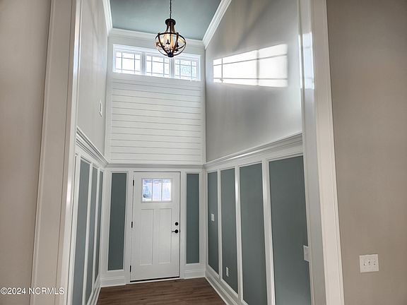 Stunning new 3 bedroom, 2 bath custom designed home located in Carolina Shores North. When entering the home you are welcomed by the grand foyer which features custom wainscotting, shiplap and accent paint color. The kitchen offers quartz countertops, stainless appliances, a slide in convection oven with air fryer, dishwasher, microwave, stainless farm sink, white herringbone subway tile backsplash. The all-wood cabinetry comes with easy close doors and drawers. The dining area off the kitchen is beautifully finished with high wainscotting. Heavy crown molding is found in the foyer, living area, and master bedroom. The living area comes with shiplap and custom trim. Master bedroom offers trey ceilings with heavy crown molding and accent color and a large walk-in closet. The master bath comes with dual vanities, quartz countertops, and custom tile shower. This home has 9' walls with 6' windows, not the standard 8' walls with 5 windows.