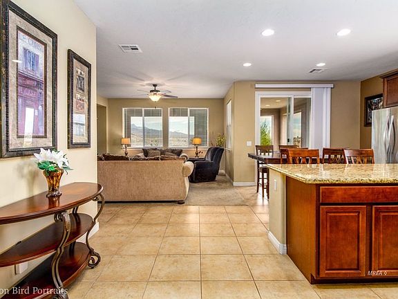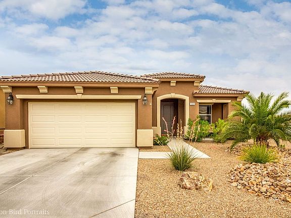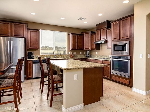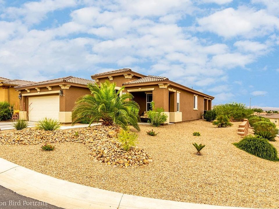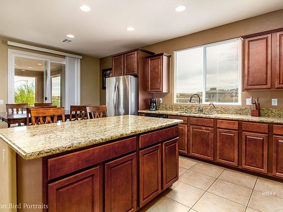 Beautiful "ELEVATED CORNER LOT". Attractive 20 x 20 tiled floors are in the entryway, kitchen, hallways and dining area. Kitchen has an extremely well laid out floor plan with a large "CENTER ISLAND BUFFET"...such a popular feature when entertaining quests. Granite counter tops throughout the kitchen with cabinets that are beyond plentiful. The entire south side of the home has large picture windows that bring in lots of natural light to the kitchen, dining area, living room and master bedroom. Living room has views out to the backyard as does the dining area. Dining area has a sliding glass door from the kitchen out to the patio...perfect for BBQ's. Entire back patio has south facing views of the mountains in the distance and is covered and very spacious. Backyard has vibrant colorful landscaping with a large side yard to the west. Being an "elevated corner lot" you have no neighbors looking into your backyard. Washer and Dryer are included with the sale of this home, as are all kitchen appliances. Bring your cash buyers !!!