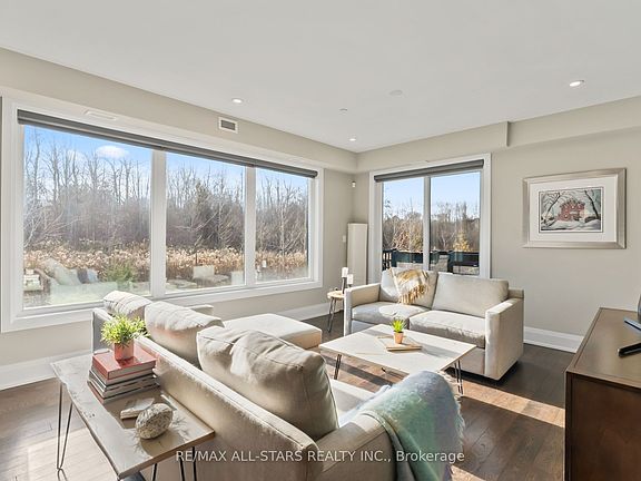 Discover refined living in this beautifully crafted two-level corner condo, offering over 1,207 sq. ft(Per MPAC). of contemporary design in one of Uxbridge's most sought-after boutique residences. The main level welcomes you with an airy, open-concept layout featuring a sleek modern kitchen with a large waterfall-edge island, warm wood cabinetry, stainless steel appliances, and stylish pendant lighting-perfect for effortless entertaining. The spacious living area is framed by expansive windows that showcase serene natural views, filling the space with soft, inviting light. A private balcony extends your living outdoors, creating the perfect spot to unwind in peace and privacy. On the lower level, retreat to two generously sized bedrooms, each enhanced with rich hardwood flooring and oversized windows that bring the tranquility of the outdoors inside. The luxurious 4-piece bathroom offers a spa-inspired experience with stylish heated tile floors and modern finishes, while a chic main-floor powder room adds everyday practicality. Set within an intimate 12-unit building, this residence provides a rare blend of elegance, community, and convenience-complete with a storage locker and dedicated parking. Located just steps from Uxbridge's vibrant downtown, charming local shops, cozy cafés, and scenic trails, this home delivers the perfect balance of upscale modern living and small-town comfort. A truly exceptional opportunity in one of Uxbridge's most desirable locations.