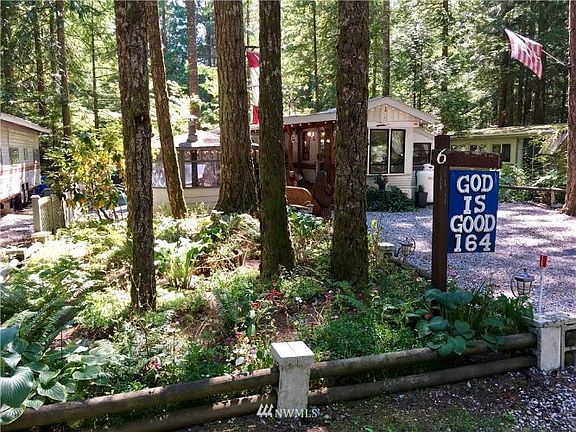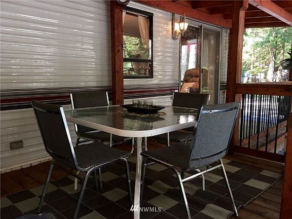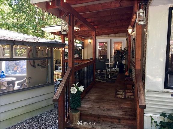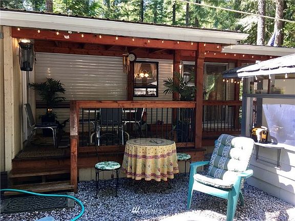 Park model w addition and gazebo sleeping 6 in the Glen at Maple Falls. Newer treated wood deck w black iron railing leading to french doors into new cedar add-a-room boasting lots of light, hide-abed and laminate flooring. Park model has much storage throughout w full bath, hide-a-bed in living room looking out bay window. Lighted gazebo w antique wood stove and new brick floor. Lovely graveled firepit area in center providing much privacy.