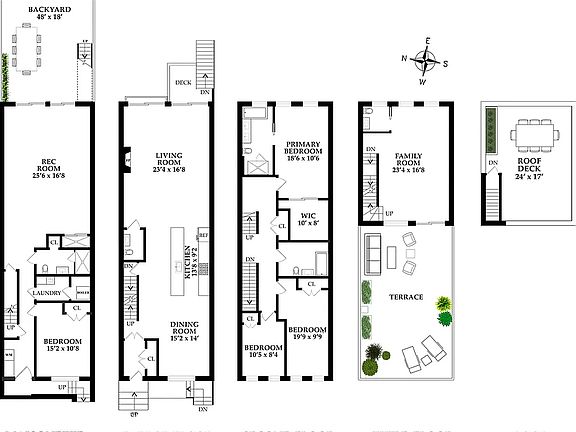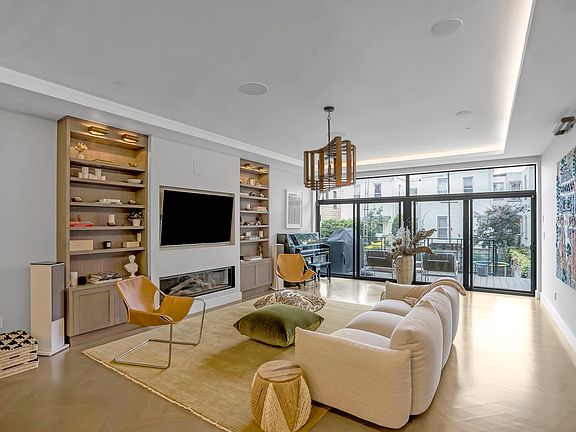 Available Fully Furnished for July and August. Welcome to 164 Diamond Street, a gorgeous, fully furnished townhouse in the heart of Greenpoint, Brooklyn. Available to rent for July and August, you have the opportunity to live in Brooklyn's most sought after neighborhood during the most beautiful time of year. This expansive home includes 4.5-bedrooms, 3-full-baths, 2-half baths, 3 private outdoor spaces and offers 3,600 square feet of sophisticated living space where every detail has been carefully crafted to provide a luxurious living experience. As you enter, you'll be greeted by loft-like ceilings, oversized windows, and striking open tread staircases. The kitchen is a masterpiece for any culinary enthusiast, featuring an 18-foot custom marble countertop, bespoke cabinetry, and high-end appliances from Subzero, Wolf, and Bosch. The extended living room, with its large remote-operated gas fireplace and half bath, flows seamlessly into a separate dining room and out to a two-level private backyard oasis. The backyard is designed for both beauty and functionality, with a grassy area, a richly hued IPE wood fence, and elegant lighting for evening gatherings. Retreat to the bedroom floors, where the primary suite offers a walk-in closet and a spa-like atmosphere with imported marble, a soaking tub and separate shower. This floor also features 12-foot ceilings and custom-built closets, including a spacious linen closet in the hallway. This home ensures comfort throughout the year with radiant heated floors in all living spaces and bathrooms. The top levels are stunning, with a custom built home office area with three desks and additional seating. From this room you can access the enormous terrace that features an outdoor kitchen and grill for al fresco dining and gatherings! Up to the next level you'll find a roof deck with another lounging area showcasing unobstructed views of the Manhattan and Brooklyn skylines. The lower level is designed for entertaining, complete with a full bar, a small kitchen, a full bath, and another full bedroom with direct access to the garden. Additional features include built-in surround sound throughout the home, a high-efficiency boiler, central heat and AC and ample bike and storage space. And easy access to Manhattan and all it has to offer! Schedule your visit today to experience the exceptional quality and comfort of this remarkable home. The Neighborhood: Situated in the vibrant neighborhood of Greenpoint, you are just moments away from McGolrick and McCarren Parks and some of the best restaurants, coffee shops and nightlife in the world. Greenpoint is a dynamic neighborhood that exudes a distinct charm, blending industrial heritage with a vibrant cultural scene. You'll be captivated by tree-lined streets, historic brownstones, and an eclectic mix of local businesses, making it a sought-after destination for residents and visitors alike. Foodies are spoiled for choice with an array of renowned restaurants, each offering a unique experience. Head to Lillia, where Chef Missy Robbins delights diners with her inventive Italian cuisine or Bernie's for a taste of classic American comfort food with the best Martini and vibes in town. Beyond its culinary delights, Greenpoint boasts a thriving arts scene, with galleries, boutiques, and cultural institutions dotting its streets. From waterfront parks offering stunning views of the Manhattan skyline to hidden gems waiting to be discovered around every corner, Greenpoint invites exploration and promises unforgettable experiences at every turn.