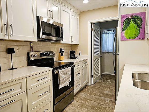 Newly Remodeled Condo in the highly sought after Chetola Resort located in downtown Blowing Rock! This 2 bedroom, 2.5 bathroom condo is a blend of elegance and convenience. Usable sqft is well above the MLS SqFt stated. Please ask for measure report for details. Beautifully remodeled living space and a dedicated parking spot at your door, step inside and prepare to be enchanted! This condo has undergone a stunning transformation. The newly remodeled kitchen boasts stainless steel appliances, a convenient built-in microwave, quartz countertops, tiled backsplash, custom cabinets, hardwood floors with an airy floorplan. The laundry room on the main floor for added convenience, updated HVAC system and new water heater. The living room features a gas stone fireplace. This inviting space seamlessly flows to one of three covered balconies. The primary ensuite features vaulted tongue-and-groove wood ceilings, walk-in closet, and a recently remodeled bathroom. Additional highlights include a versatile bonus room that can serve as extra storage space, a bunk room for guests, or a home office. The second bedroom has a newly remodeled bathroom and private covered balcony. The area offers a wealth of activities to enhance your mountain living experience. Enjoy dining at the on-site restaurant and indulge in relaxation at the spa. Take advantage of the Optional Chetola Resort Membership to enjoy the resort's many amenities: Take a dip in the indoor swimming pool, play tennis or pickleball, maintain your fitness routine in the well-appointed fitness center and explore the great outdoors with hiking trails and a variety of other activities. This exceptional Chetola Resort condo presents a unique opportunity to own a piece of Blowing Rock's finest. Act fast, as this gem won't stay on the market for long.