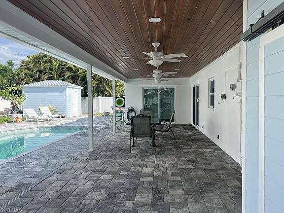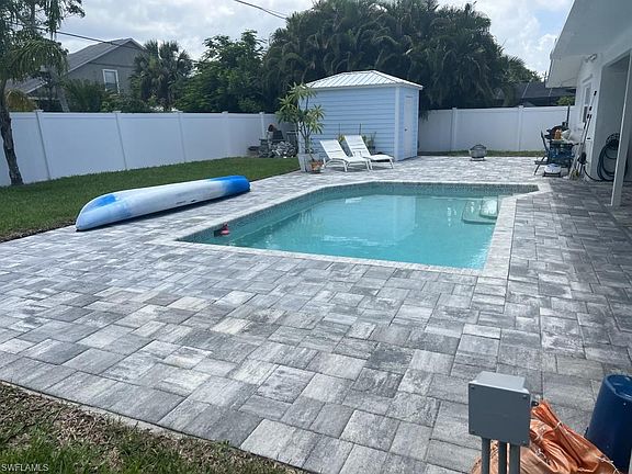 Spacious 2bed/2bath/2car garage with a pool single family home with ample storage near shopping and beaches is a must see. No HOA! 17ft x 35ft back porch overlooking pool and recently sodded back yard. Newly renovated from top to bottom-kitchen and bath with wood cabinets and quartz counters, porcelain wood plank tile through-out, A/C units and ducts, old insulation removed and replaced with foam insulation making attic spaced usable for storage, new windows and new hurricane impact sliding glass doors and insulated hurricane impact garage door, new roof and gutters 2022, new sprinkler system and pump 2023 uses well water for irrigation, newly installed pavers surrounds the house and updated pool, pool has heater, shed with electricity and a/c unit along with pool closet for extra storage. Privacy fence with double gates making it possibly to store RV /trailer or boat on north side of house. Flood insurance is transferrable.