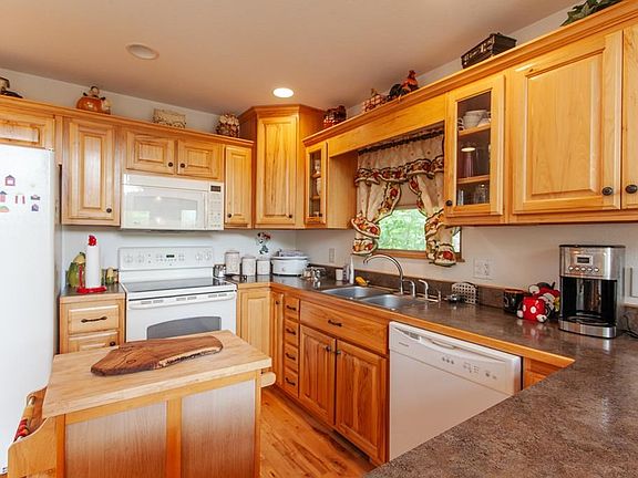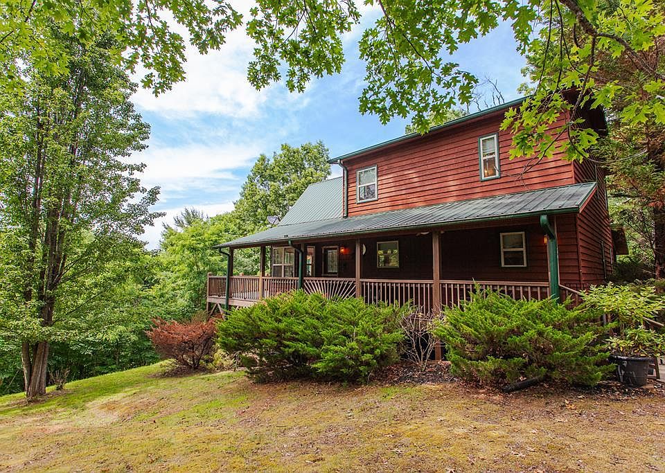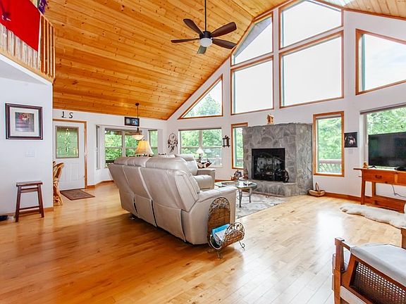 Beautiful, large prow-front Chalet, incredibly maintained on a level wooded lot with a mountain view. Sunsets from your wrap-around upper deck or concrete patio on the lower level. All paved roads and driveway for easy access. Open floor plan design with hardwood floors. Tongue & groove ceilings, hickory cabinets and a stone fireplace with gas logs. The fully finished basement has a recreation room, a full bath, and an additional 3rd sleeping area. Over-sized 2 car detached garage with separate workshop area & additional attic storage. Large garden area. Great location, close to town and shopping, Paved with easy access!