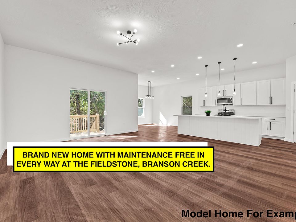 BRAND NEW HOME WITH MAINTENANCE FREE IN EVERY WAY. Enjoy peace of mind with this new construction home, offering modern convenience and low maintenance. Built with the latest materials and technology, this home has a one-year builder's warranty, meaning minimal upkeep and fewer worries for years. No need to worry about repairs or updates--everything is brand new and designed to last, giving you more time to relax and enjoy your beautiful new home. On top of that, the association takes care of your landscaping. Living in the most desirable Branson Creek neighborhood, ''The Fieldstone.' includes excellent amenities, outdoor pools, an exercise room, and a clubhouse. THE BEST OF THE TWO WORLDS. Owning a house but having the benefits of the condo ownership. This open-concept layout is on one level, with no steps, which delivers easy access and mobility. Imagine yourself preparing meals in your fully equipped kitchen with quartz countertops, stainless steel appliances, ample counter space, and a large island perfect for your casual dining and entertainment. The master bedroom is very large, with an en-suite bathroom and walk-in closet. Three additional bedrooms are ready for a big family or your envious guests. Less than a mile away, you will enjoy access to world-class golfing facilities--five Tiger Wood golf courses, restaurants/bars with panoramic views, and more. You will feel like you live in a vacation area, enjoying serene surroundings and a relaxed lifestyle every day. AS A BONUS, an irrigation system is included. Convenient access to shopping, dining, schools, groceries, hospital, Branson airport, and Highway 65. NOW IS THE TIME TO ACT!