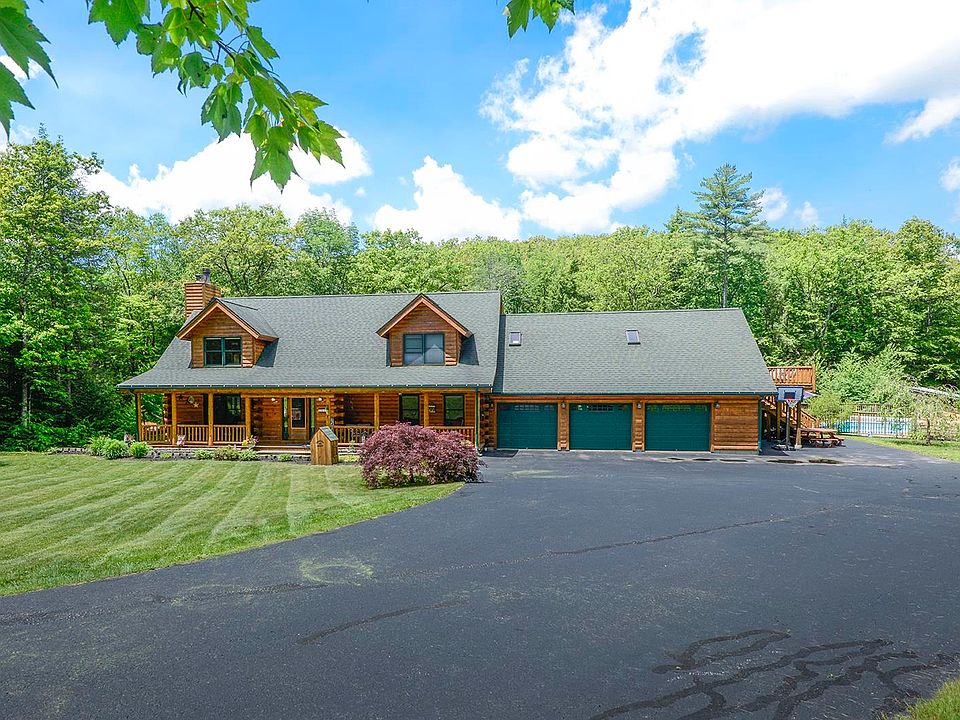 Nestled on the serene Gunn Rd, this 30-acre property offers a peaceful and picturesque escape from the hustle and bustle of city life while being minutes to schools, churches, shopping, amenities and entertainment in Keene. Come see this beautiful log home with open-concept living/dining/kitchen designed to have family and friends all together. Enjoy cozy winters sitting by the fireplace. Entertain by the pool in the summer. The kitchen is ready for small family dinners or large gatherings with a curved center-island sink, granite counters, pasta-water faucet over the stove, two refrigerators and three sinks. One-floor living is possible with the primary en-suite and laundry area on the first floor. Upstairs has 2 bedrooms, a full bathroom, and a loft with Murphy bed. The walk-out basement with private patio has two rooms for offices or guests and the media room is set up for movies and has a wet bar. Plenty of room to finish off, if you need more space. Choose between sitting on the front farmers-porch or private back deck. The room over the 3-car garage has a private balcony and can be finished to your liking. Bring your ATVs for trail riding on your property. Minutes to Bretwood Golf Course and Cheshire Medical Center providing easy access to recreational activities and healthcare services. 30 minutes to I-91, 1-hour to skiing, 2-hours to Boston or the NH seacoast. OPEN HOUSE - Sunday, 7/16/23 from 11-1