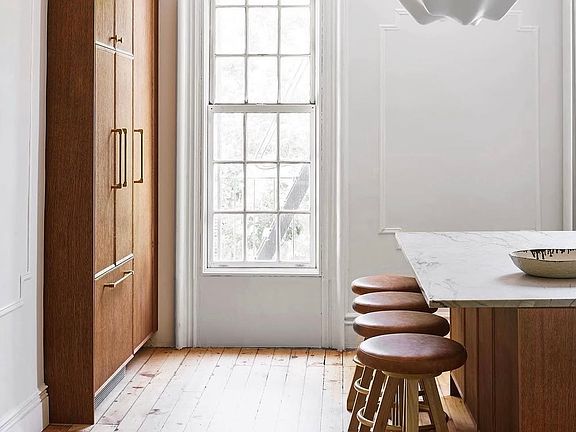 Discover this stunning two-bedroom, two-bath townhouse in Brooklyn, featuring a private entrance and high-end finishes. The spacious primary bedroom accommodates a king-sized bed and boasts custom closets, with French doors leading to a serene stone-paved patio. The second bedroom is also king-sized and includes custom storage. The primary bathroom showcases luxurious Waterworks fixtures, heated floors, and towel bars, plus convenient access to a separate laundry room with a full-sized washer and dryer. Upstairs, enjoy impressive ten-foot ceilings, which includes a gourmet kitchen with a large stone island, Reform cabinets, and Bertazzoni appliances, including an ice maker, a disposal, and dishwasher. The private deck, designed to seat eight, overlooks the backyard, perfect for entertaining. The living/dining room features restored pocket doors, a working marble fireplace, and custom floor-to-ceiling silk drapes, enhancing the home's charm. Photos are from the 2024 Domino and Brownstoner shoots, with more images and a video coming soon. Please note, this townhouse is dog-friendly but does not allow cats. This exceptional rental combines luxury and comfort, making it a perfect home for discerning renters.