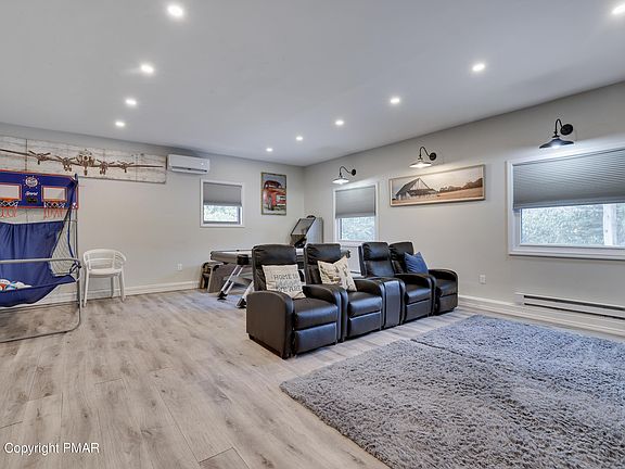 Turnkey STR investment generating $72K in Revenue Last Twelve Months. Unique Poconos gem on 2 private acres surrounded by evergreens. Recently renovated from top to bottom including living spaces, kitchen, flooring, bedrooms, all bathrooms and furniture. 5 BRs and 2 full baths spanning 2,000+ square feet w/ 3 living spaces including a 400+ square feet theater and gameroom, an open living room dining and kitchen with soaring ceilings and 20 foot stone fireplace plus a loft. Huge backyard deck with hot tub and outdoor furniture. Off the deck there is a firepit and room for a lot more amenities. Rare to find a turnkey 5 BR with so much privacy and outdoor space. With the money you'll save on renovations and furniture, you can go all out in the backyard!