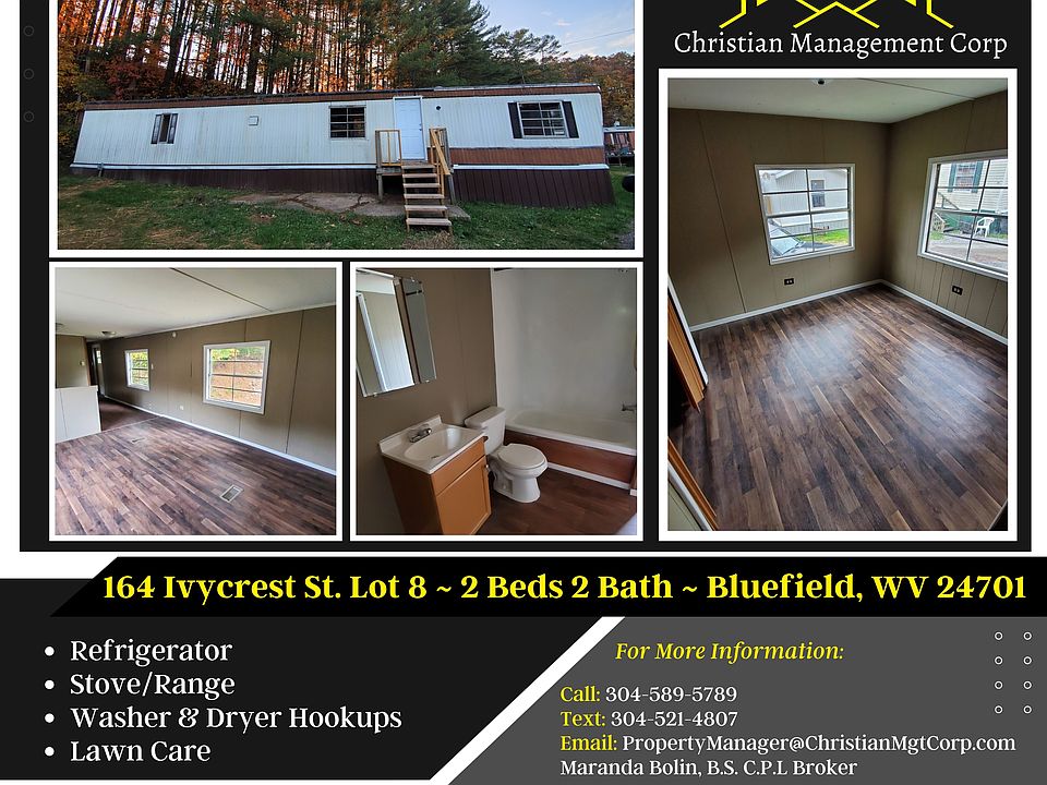 164 Ivycrest St. Lot 8 ~ 2 Beds 2 Bath ~ Bluefield, WV 24701 $99 MOVE-IN SPECIAL LEASE OPTION (Path to Home Ownership): Initial payment: $1,500 with no payments due until the 1st of the following month! Monthly payment: $595/month. Includes lawn care. No other utilities included. or RENTAL: Security Deposit: $595. Can be made in payments if needed. Monthly payment: $595/month. Includes lawn care. No other utilities included. Sorry, this home is not HUD approved. This 980sq, ft. 2-bed 2-bath single-wide mobile home includes a stove and fridge, small flat yard, and washer and dryer hookups. This home is located off of Blue Prince Road in Green Valley close to Mercer Mall and US Highway 460. You will be minutes away from Princeton or Bluefield, and all of the banking, grocers, and shopping in the area! Christian Management Corporation Office Hours: Mon-Fri 9:00AM-5:00PM & 10:00AM-2:00PM the 1st Saturday of every month You can view THIS property 7 days a week! Most pets welcome with a $300.00 pet fee per pet and signed pet agreement. Maximum 2 pets. No aggressive breeds due to insurance restrictions. Clean, safe, quiet, crime & drug-free are our priorities for our residents! We support Equal-Housing Opportunities! Good people with good, bad, low, or no credit but stable employment or Social Security are welcome. -MUST pass background check -NO evictions in the last 7 years -NO sex offenders Is this property not what you are looking for? View our other available #homes, #mobilehomes, #apartments, and more on our Facebook or our website!