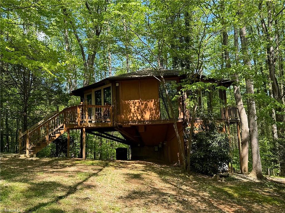 UNIQUE property nestled in nature. GREAT LOCATION has very private and serene feel but less than 5 minutes to shopping, restaurants and local hospital. Quick and easy access to Hwy 77, local vineyards, Stone Mountain State Park, local country club and golf course, downtown Elkin and so much more. With tons of character and charm, this home features open studio style living on the main level, beautiful granite countertops and tile backsplash, stainless steel appliances (all convey), hardwood floors and floor to ceiling windows. Lower level is the bedroom, again w/floor to ceiling windows, a separate laundry room and additional unfinished bathroom. Off the main level, you'll enjoy the expansive wrap around deck. So many unique touches that make this "treehouse" something special that you gotta see. This property has tons of potential as a vacation home and/or investment property.