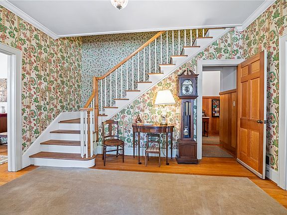 The central hallway, lined with warm cypress wood, guides you to a second living room or den, complete with a wood-burning stove and paneled in striking Upstate White Pine. At the end of the hall, the master suite offers two full baths, multiple walk-in closets, a sunroom filled with natural light, and a private basement office or storm shelter, perfect for working from home. The main level also includes a guest bedroom with built-in bookshelves, ideal for use as a library or secondary office, along with a full guest bath.